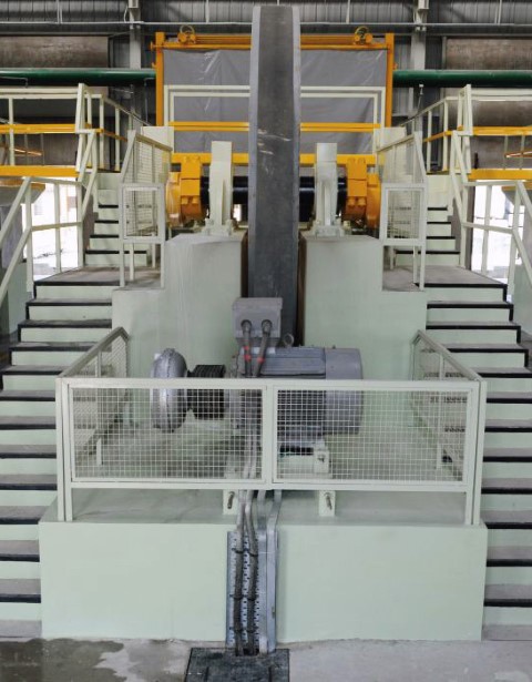 The BLOCK TROLLEY PLATFORM is made out of heavy plates fabricated structure situated between four pillars and lifted by 90 mm dia. LEAD SCREWS and heavy duty G. M. LEAD NUTS attached to every pillar. The lead screws works simultaneously which are synchronized with lay shafts and chains system and coupled to auxiliary motors and reduction gear boxes. The trolley platform lifting on TWO PRISMATIC AND TWO PLAIN VERTICAL SLIDES WAYS which are hard chrome plated to protection against rust and ensure durability too. The prismatic slide ways prevent any deviation of lifting away from vertical axis.